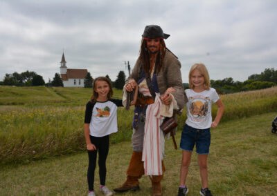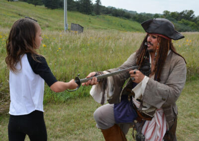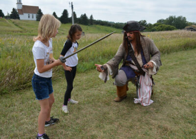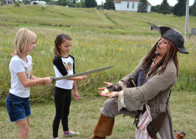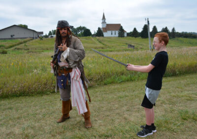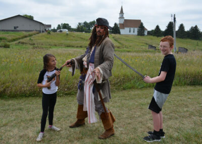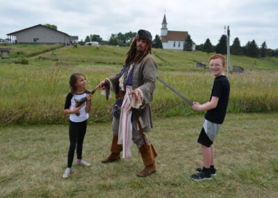 HISTORY HAYDAY! The Clay County PALS made a trip to Jackson, Minnesota, to take in the Ft. Belmont Pioneer Days today. Our numbers were down for the event due to poor timing before school reconvenes for the year. But our little gaggle had a lot of fun and enjoyed great, hands-on learning about the pioneers. Minnesota’s Jack Sparrow was at the fort, which made an EXTRA exciting day. We’re grateful for grant funds provided by the Walden Family Foundation to cover our day, which included a big Sunday lunch, fun and home made pie at the fort, time at Spirit Lake’s Splash Pad and Blizzards at the Milford DQ.